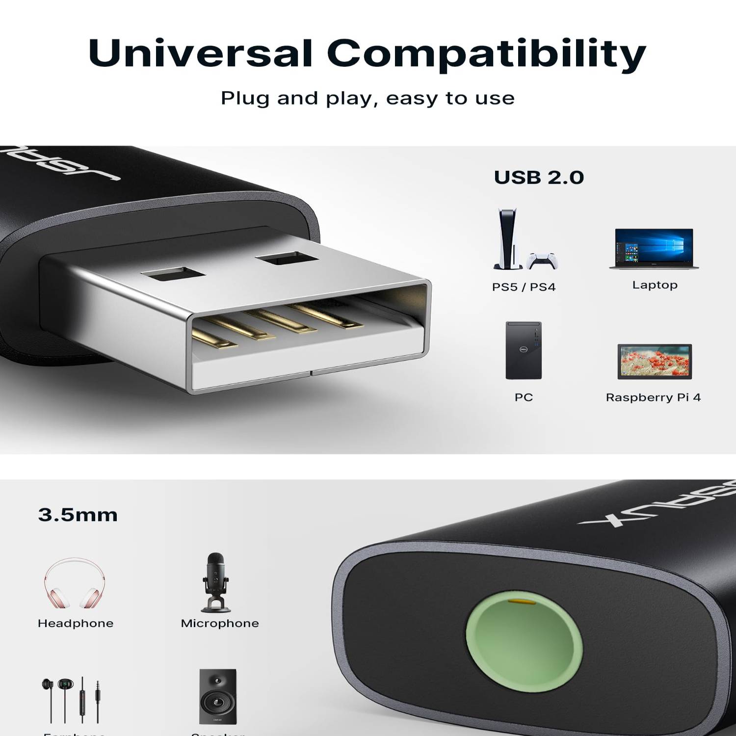 The JSAUX 2 Pack USB to 3.5mm Jack Audio Adapter is a versatile external stereo sound card designed for seamless audio connectivity across multiple platforms including PS4, PS5, Windows, Mac, and Linux. Featuring USB 2.0 plug-and-play functionality, a high-fidelity sound chip for crystal-clear audio, and broad device compatibility, it’s the perfect solution for professionals and gamers needing reliable, portable audio enhancement without driver hassles.