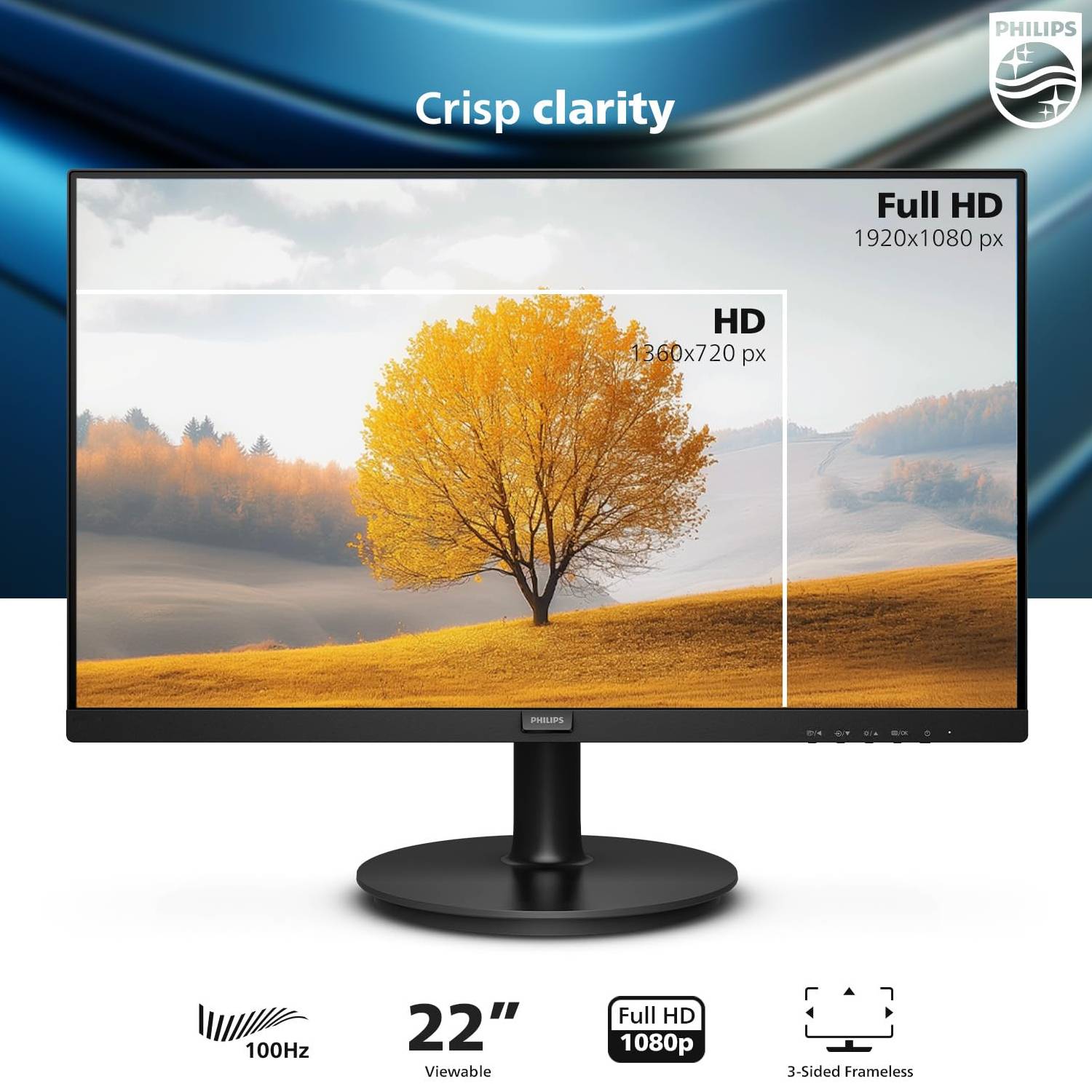The Philips 221V8LB is a 22-inch Full HD monitor featuring a 100Hz refresh rate and Adaptive-Sync technology for smooth, stutter-free visuals. Its VA panel delivers vibrant colors and wide 178° viewing angles, while LowBlue Mode reduces eye strain. Perfect for professionals and gamers alike, it comes with a 4-year advance replacement warranty for peace of mind.